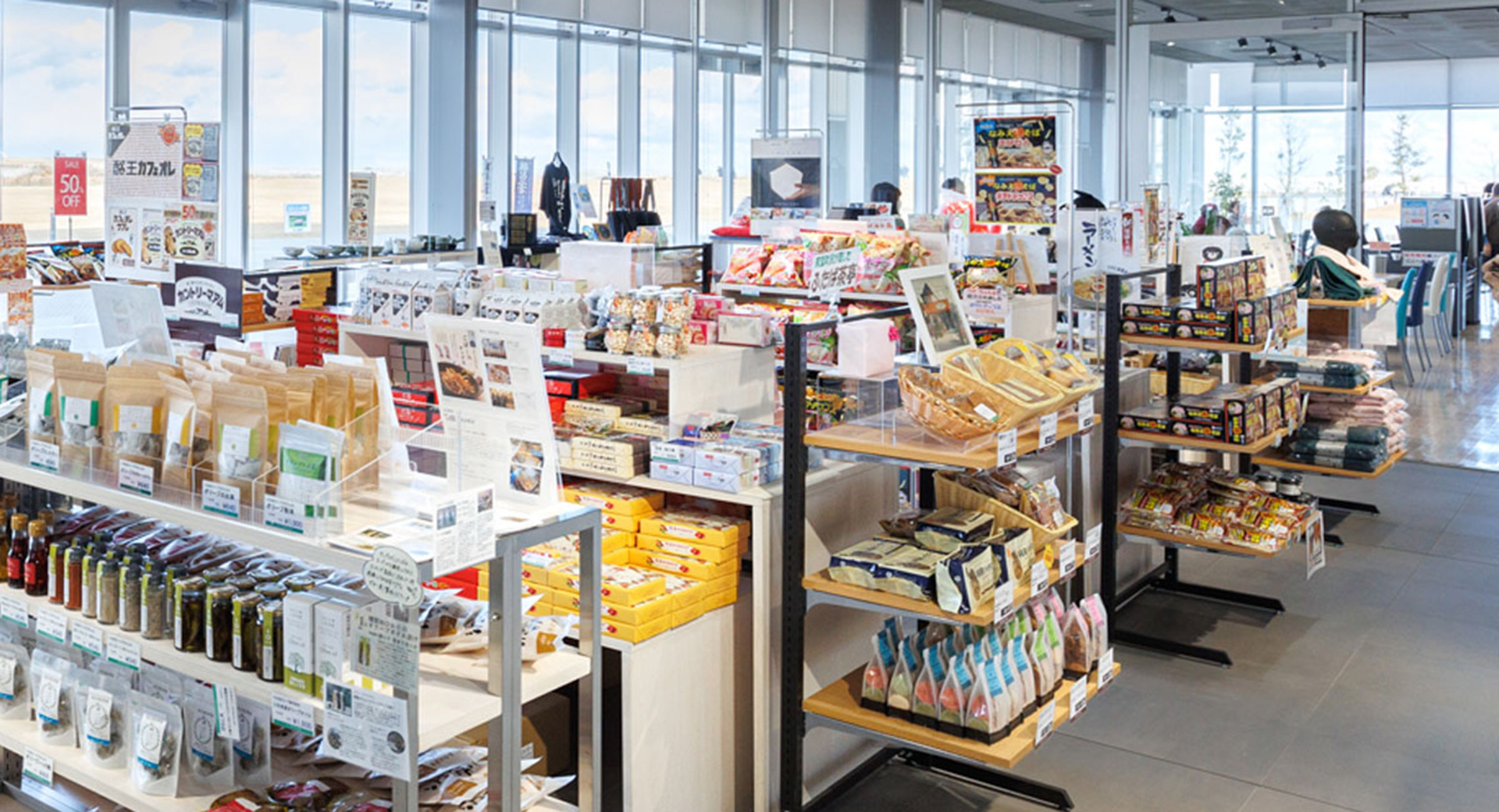 『Futaba Business Incubation Community Center』の頭文字から名付けられた『F-BICC』、通称双葉町産業交流センター。相双エリアの名産品などが揃う『サンプラザふたば』では、双葉町の名産品「双葉だるま」や、岐阜県の撚糸製造・タオル販売業者である浅野撚糸と双葉町が共同開発した高品質タオル「ダキシメテフタバ」などの商品ラインナップが並びます。